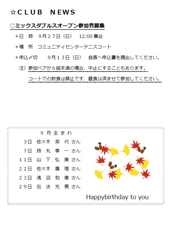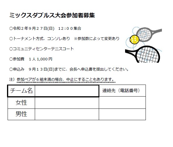 9月に予定されていたミックス大会はコロナの影響のため中止となりました。