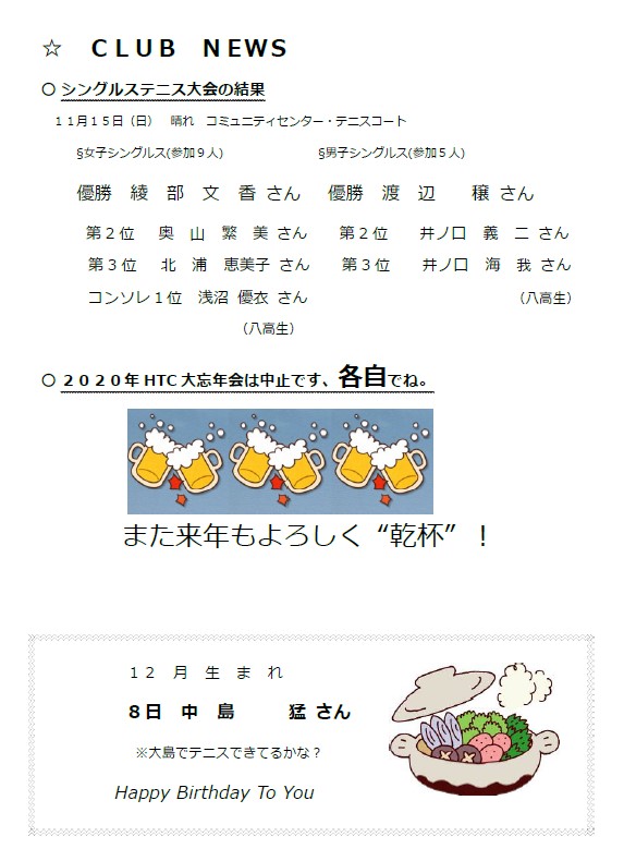 寒い日が続きますが,頑張ってテニスをして、日光浴をして免疫力を高めましょう!!