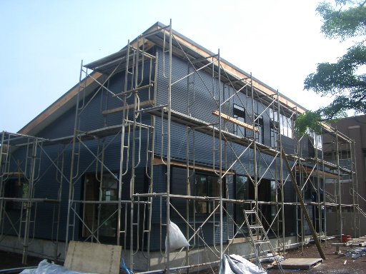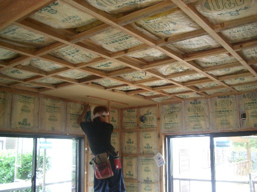 井ノ口邸施工状況 井ノ口邸の外壁は2色のサイディングを貼り分けています。 写真ではわかりづらいでしょうか? 内部は天井のプラスターボードを張り始めました。 天井の木下地の間に黄色く見えるのは断熱材です。
