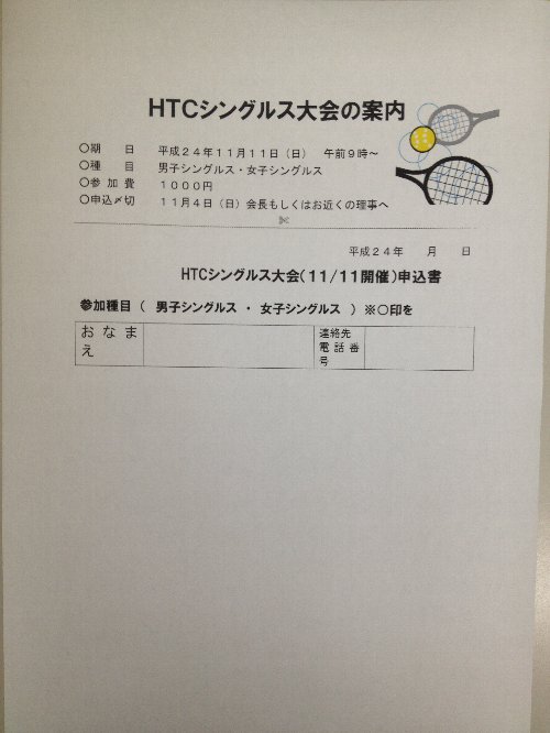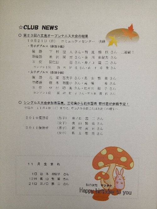 HTC2012 11 会報 HTCの11月の会報です。 すこしアップするのが、遅くなりました。 私は所用のため、出場できませんが、11月11日はシングルス大会です。 三宅島から去年のディフェンディングチャンピオン 野村さんが参戦予定です。
