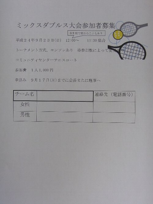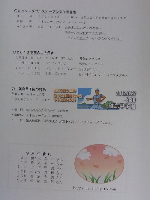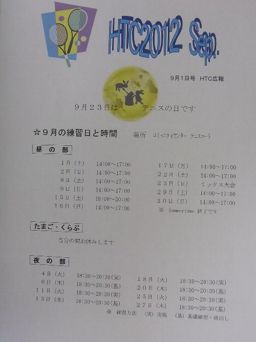 HTCの9月の会報です。 サマータイムが終わりまして、土日の練習日は14:00からとなります。 9月23日 ミックス大会です。