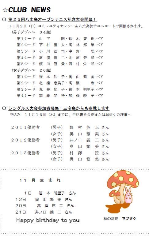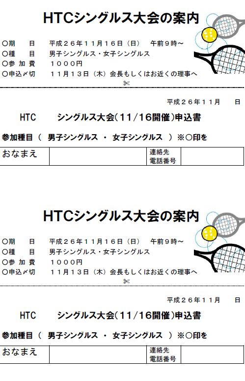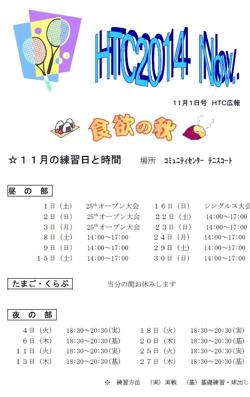 HTC 11月会報 HTCの11月の会報です。 11/2の25回記念オープン大会は皆様の御協力のおかげで 無事に開催することができました。 ありがとうございました。 詳細はまた 報告します。 HTC201411