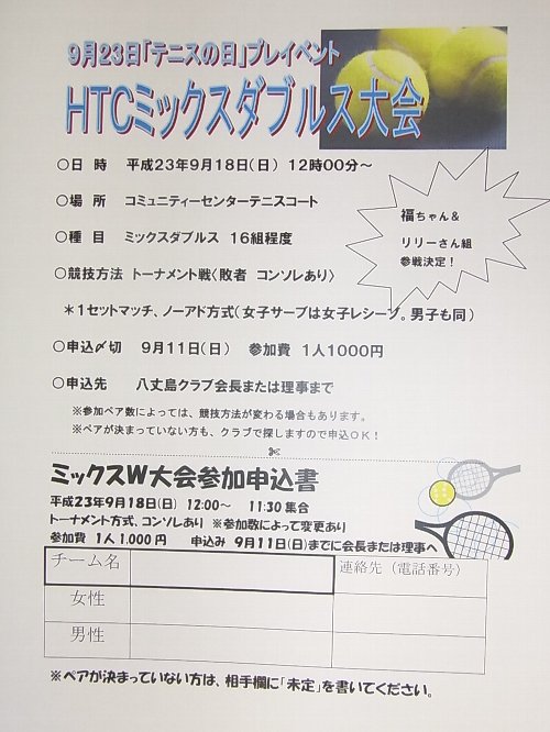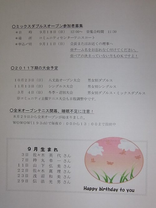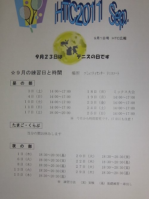 HTC 201109 の会報です。 今月はミックスダブルス大会が9月18日に行われます。