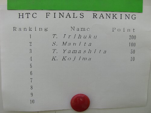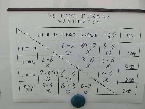 月例シングル大会 JAN 1月の月例シングル大会を、25日の日曜日に行いました。 今回の参加者は、間仁田、真理、小嶋、卓哉 の4人です。 風もなく、絶好のテニス日和。 僕は、1試合目、小嶋くんと対戦、 5-2 の40-0 のリードから、逆転負けでした、情けない。 このまま、全敗かと思いましたが、そのあと、2連勝で、得失ゲーム差で1位と なりました。 ラッキーでした。 勝手につけている年末時点のシングルのランキング表です。