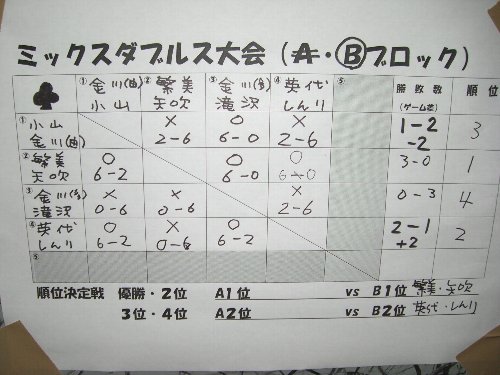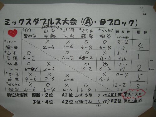 八丈島テニスクラブ ミックスダブルス大会 かなり、ひさびさのブログの更新です。 9月29日、八丈島テニスクラブ主催のミックスダブルス大会が コミュニティセンターで行われました。 僕はりりーさんと組んで、2勝2敗。 もうすこしできた気もしますが・・・ 次は10月21日のオープン大会です。 結果は以下の通りです。 優勝した繁美・矢吹ペア 準優勝した山本・安藤ペア
