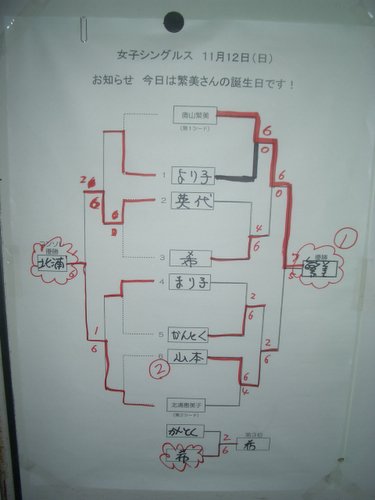 テニス シングル大会 htcのシングル大会が強風のなか 行われました。 男子の優勝は北沢さん、女子は繁美さんでした。 僕は1回戦は真理さんに1-6で負けて、 コンソレは斉藤さんに5-7で負けて、2連敗。 相変わらず勝てませんね。 次の大会は12月3日です。