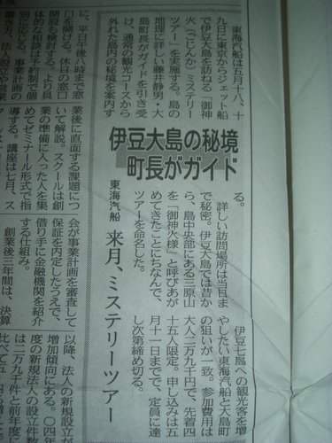 大島ミステリーツアー 先日の日経新聞に大島町の話しが掲載されていました。 藤井町長が通常の観光コースから外れた大島の秘境を案内する 「御神火ミステリーツアー」。 東海汽船とのタイアップで、5/18、19日で実施するそうです。 八丈島の秘境といったらどこになるのか、すこし考えてしまいましたが リストアップしたら、結構ありそうですね。 すこし脚力が必要そうですが・・・。